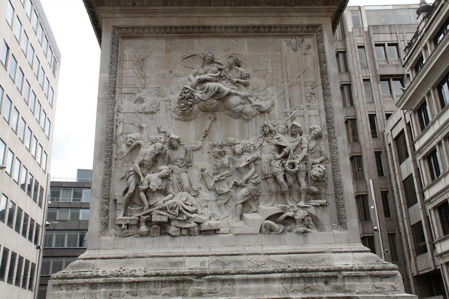 En la base del monumento se pueden ver bajorrelieves e inscripciones en latín de escenas que acontecieron los días siguientes del incendio, como las decisiones que tomó Carlos II y la historia de la construcción del monumento. En una de las caras se explica con detalle los hechos acontecidos el día del Incendio.